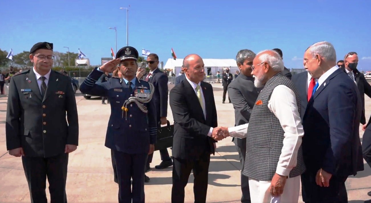 Mhow: In a display of enduring friendship and strategic alignment, Indian Prime Minister Narendra Modi was accorded a warm reception by Israeli Prime Minister Benjamin Netanyahu upon his arrival at Ben Gurion International Airport in Tel Aviv today. The two leaders shared a heartfelt handshake amid a ceremonial guard of honor, with Indian and Israeli flags fluttering in the background. This marks Modi’s second standalone visit to Israel, nearly a decade after his historic 2017 trip that redefined bilateral relations.